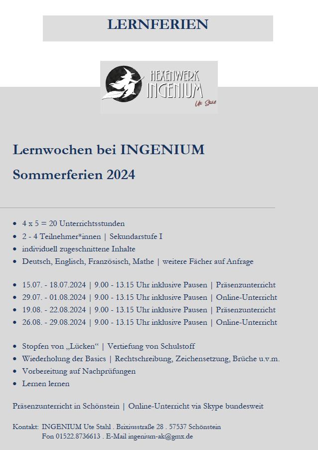 • Unterricht an 4 Tagen immer von 9.00 – 13.15 Uhr präsent oder online in Absprache